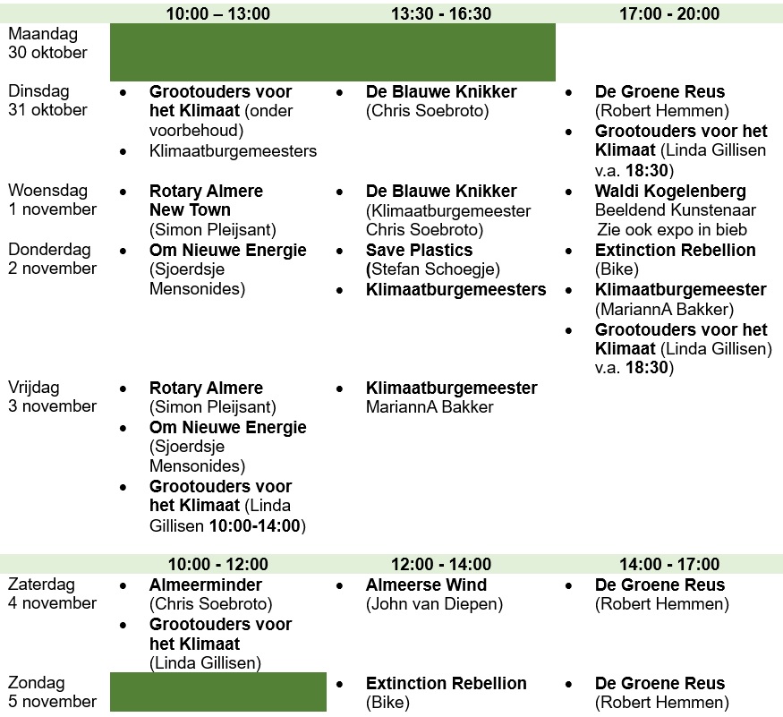 Meerdere organisaties op het gebied van duurzaamheid, klimaat en energie waren in de bieb (volgens een rooster) aanwezig. Allen gaven informatie en inspiratie. Ze gingen in gesprek over het klimaat en duurzaam leven met vooral bezoekers, jong en oud, aan de bieb.